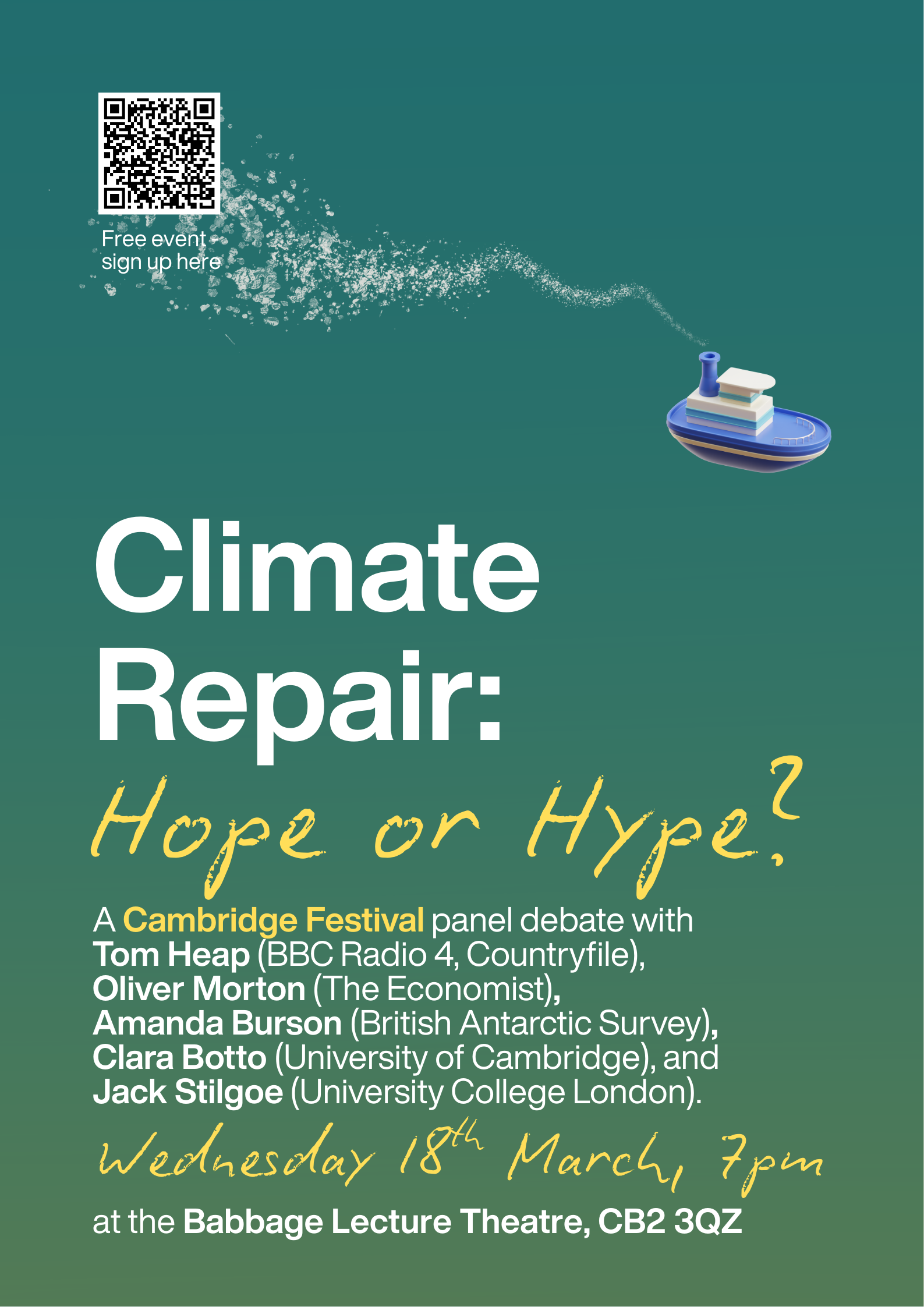 Climate Repair: Hope or Hype? a panel debate with Tom Heap (BBC Radio 4, Countryfile), Oliver Morton (The Economist), Amanda Burson (British Antarctic Survey), Clara Botto (University of Cambridge), and Jack Stilgoe (University College London).